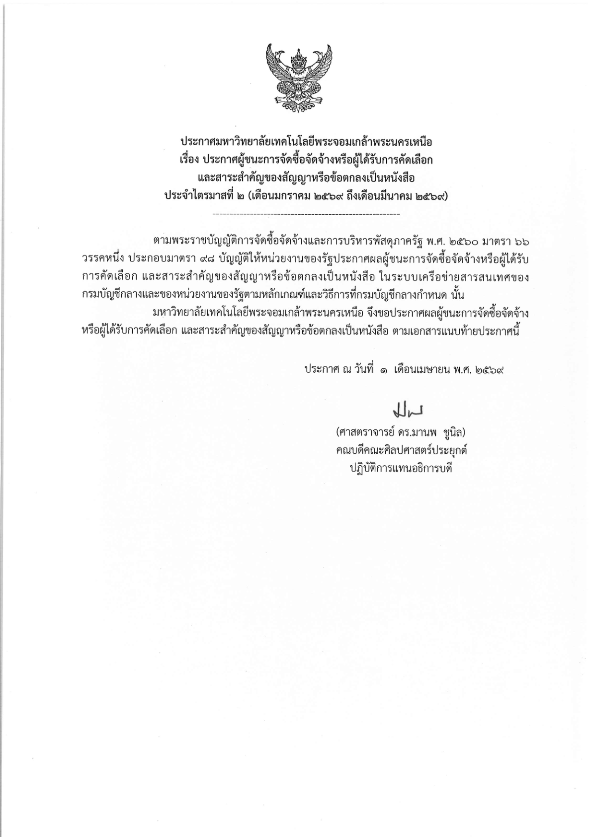 ประกาศผู้ชนะการจัดซื้อจัดจ้างฯ ประจำไตรมาสที่ 2 (เดือนมกราคม - เดือนมีนาคม 2569)